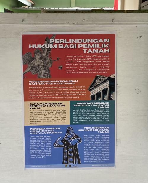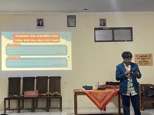 Desa Giyanti, 31 Juli 2024 - Permasalahan penyalahgunaan sertifikat hak atas tanah dan mafia tanah kerap meresahkan masyarakat khususnya di Desa Giyanti. Tim II KKN UNDIP 2024 menggelar penyuluhan hukum yang ditujukan bagi para pemuda dan pemudi desa, dengan fokus utama pada pemahaman dasar hukum terkait kepemilikan tanah dan hak atas tanah. Program ini diadakan sebagai tanggapan terhadap rendahnya pengetahuan masyarakat desa mengenai hukum tanah, yang sering kali menyebabkan permasalahan, termasuk penyalahgunaan sertifikat tanah oleh oknum lembaga desa. Penyuluhan ini dikemas secara informatif dan sistematis, dengan metode presentasi menggunakan PowerPoint yang menjelaskan langkah-langkah dalam proses kepemilikan tanah serta cara menjaga hak atas tanah secara sah. Materi yang disampaikan mencakup tahapan pendaftaran tanah, pentingnya memiliki sertifikat tanah, serta bagaimana melindungi hak kepemilikan dari potensi penyalahgunaan.